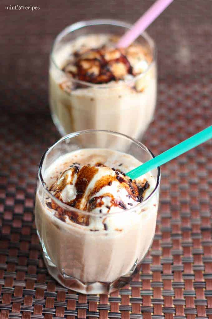 - Float a scoop of vanilla icecream and sprinkle some chocolate powder onto it. Garnish it with some chocolate syrup chopped banana and chocolate sprinklers and serve chill.