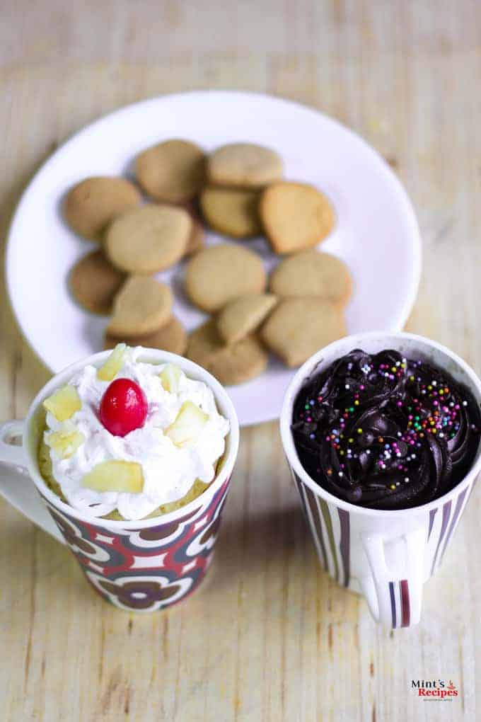 मैंने एग्लेस मग केक के दो प्रकार बनाए है। एक चॉकलेट मग केक और अनानास मग केक है, दोनों एग्लेस हैं। मग केक एक शहरी नुस्खा है जो सबसे बेसिक केक सामग्री के साथ बनाया जाता है, आटा, बेकिंग पाउडर / सोडा, चीनी और मक्खन; और इसके साथ, आप अपने पसंदीदा स्वाद के रूप में चॉकलेट या अनानस डाल सकते हैं।