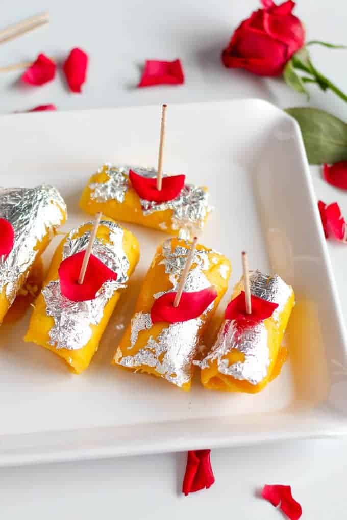 This is such a simple dessert recipe that anyone can make. I will only suggest you to take care of the slicing part of the mango. The mango slices need to be really thin, otherwise, they will break while rolling, but simultaneously you also need them to be intact sheets, without forming holes in order to make it too thin. So make neat and even slices.