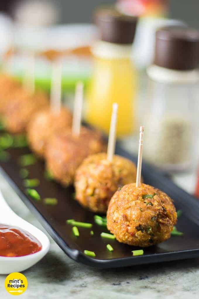 - Insert tooth pick or lollipop stick into each fried balls to make veg kurkure lollipops.