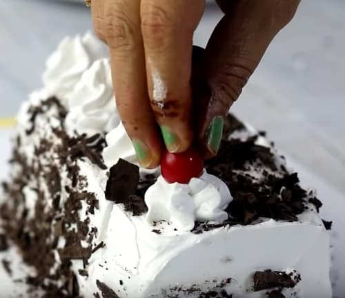 Now take the one part of the cake, pipe out whipped cream on top, put some chopped cherries and sprinkle choco chips.