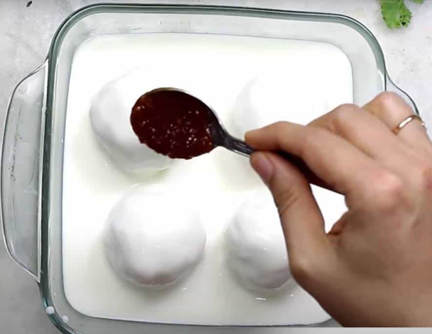 Add ½ tsp regular salt and sugar into the yoghurt and whisk to bring out a smooth and creamy texture. If the yoghurt is stiff, then add a little water to bring it to a saucy consistency.
