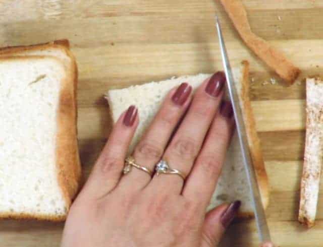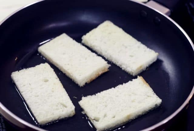 Trim the edges of each bread and cut into rectangular, square shape, triangle shape, I have cut bread in rectangular shape.