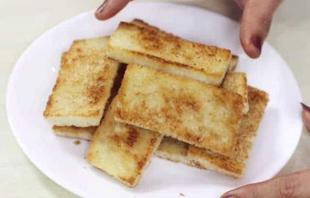 Once soaked, arrange the soaked sugar syrup bread slices in a serving plate or tray.