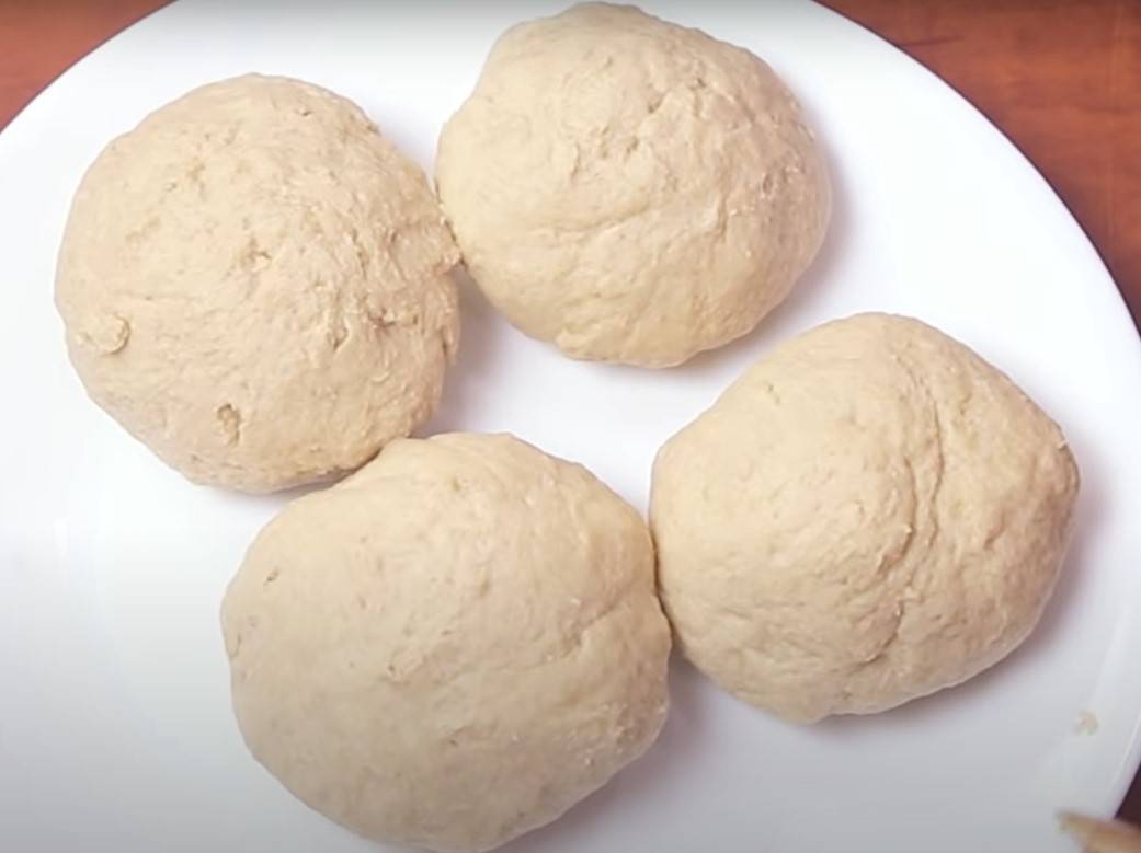 After 15 minutes uncover and divide the dough into 4 equal portions. Roll it in your palms and flatten it.