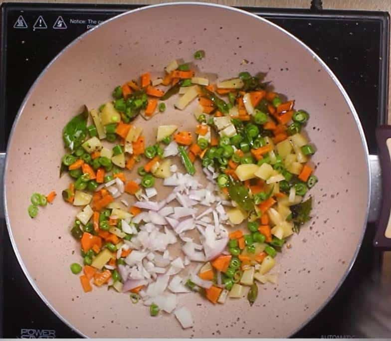 Add chopped veggies (potato, carrot, French beans, onion) and sauté for a minute.