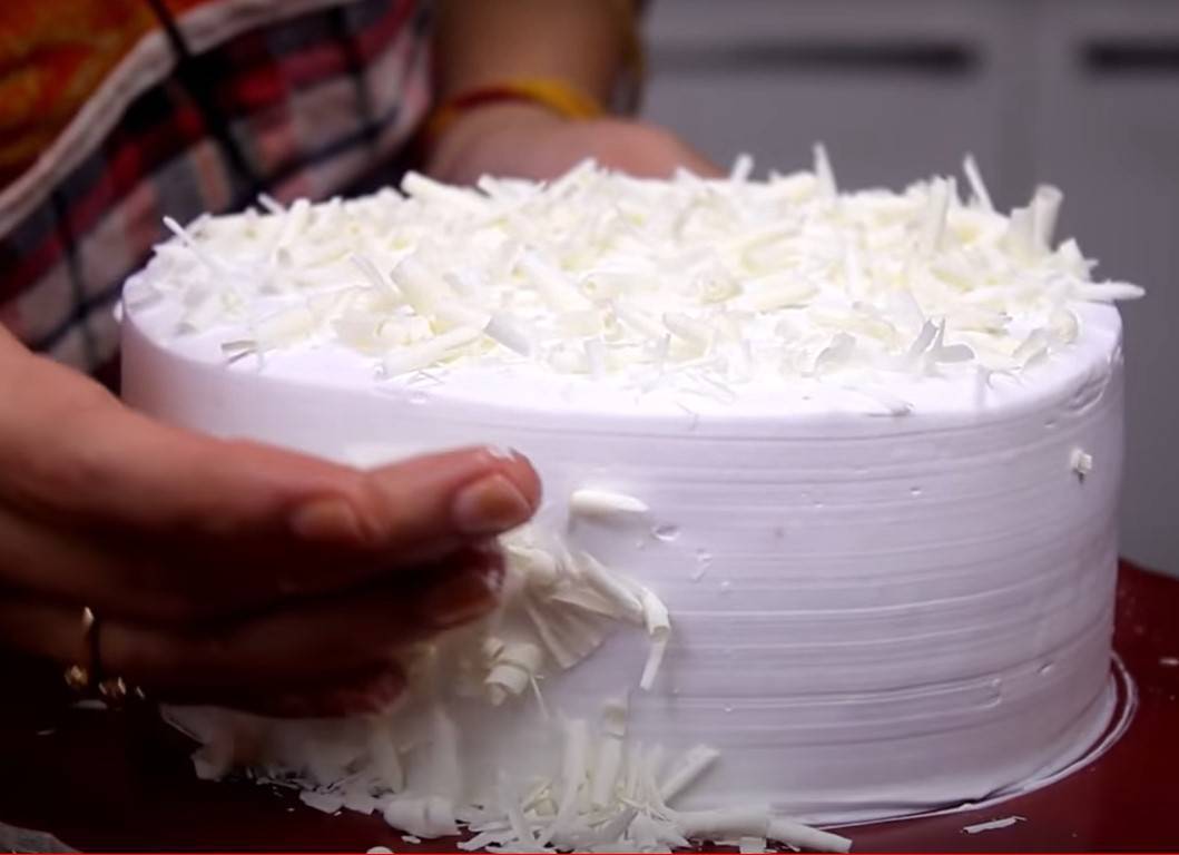 Then cover the entire cake with white chocolate flakes. Be generous.